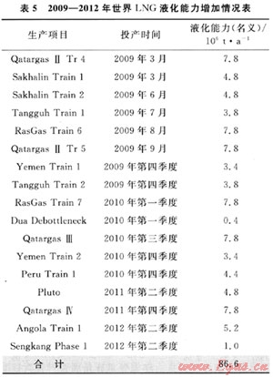 5) 中東在建的LNG項(xiàng)目在未來幾年還將投入生產(chǎn)。澳大利亞煤層氣液化的LNG將有大的發(fā)展,正建或待建的項(xiàng)目共有8個(gè),產(chǎn)能超過5000×104t/a。據(jù)IHS(Information Handling Service)公司的資料,2009—2012年新增的LNG產(chǎn)能將達(dá)到8660×104t/a(表5)。