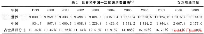 世界一次能源消費(fèi)量除2009年的金融危機(jī)造成下降外,其他各年均逐漸上升,10年總計(jì)上升了12.4%。中國(guó)的一次能源消費(fèi)量,一直處于上升狀態(tài),金融危機(jī)也沒有影響其上升的勢(shì)頭(表1),10年總計(jì)上升了133%。中國(guó)的一次能源消費(fèi)量從1999年占世界的10.3%提高到2009年的19.5%,共提高了9.2個(gè)百分點(diǎn),成為全球一次能源消費(fèi)量增長(zhǎng)最快的國(guó)家。中國(guó)正處于工業(yè)化和城市化發(fā)展階段,未來一次能源消費(fèi)量仍將快速增長(zhǎng),對(duì)中國(guó)能源供給能力產(chǎn)生了巨大的壓力,化石能源消費(fèi)量在相當(dāng)長(zhǎng)的時(shí)間內(nèi)仍將增長(zhǎng)。
