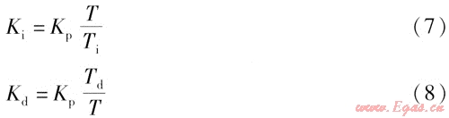 在上述離散化過程中,T必須足夠短才能保證采樣精度。為書寫方便,將e(fT)用e(f)表示,將式(4)、(5)代入式(2),化簡(jiǎn)后可得離散的PID表達(dá)式為: