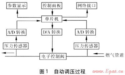 操作者通過控制中心遠(yuǎn)程或控制面板現(xiàn)場(chǎng)設(shè)定出口壓力值。在現(xiàn)場(chǎng)站點(diǎn)的入口和出口處均設(shè)有壓力傳感器,實(shí)時(shí)將入口、出口側(cè)的壓力信號(hào)經(jīng)模擬/數(shù)字信號(hào)(A/D)轉(zhuǎn)換器輸入單片機(jī),并可在液晶屏幕上實(shí)時(shí)顯示。當(dāng)出口壓力低于設(shè)定值時(shí),單片機(jī)發(fā)出的數(shù)字控制信號(hào)經(jīng)數(shù)字/模擬信號(hào)(D/A)轉(zhuǎn)換器轉(zhuǎn)換后輸出模擬電流信號(hào)至燃?xì)夥辣娮涌刂崎y,電子控制閥流量增大直至出口壓力達(dá)到設(shè)定值。當(dāng)出口壓力高于設(shè)定值時(shí),單片機(jī)發(fā)出控制信號(hào)經(jīng)數(shù)字/模擬信號(hào)(D/A)轉(zhuǎn)換器轉(zhuǎn)換后輸出模擬電流信號(hào)至燃?xì)夥辣娮涌刂崎y,電子控制閥流量減小直至出口壓力達(dá)到設(shè)定值。當(dāng)入口壓力過低或者過高、超出警戒值時(shí),系統(tǒng)可以在現(xiàn)場(chǎng)顯示報(bào)警,也可以通過網(wǎng)絡(luò)接口上報(bào)控制中心。系統(tǒng)可選用512 kb儲(chǔ)存器作為人機(jī)交互系統(tǒng)的外部?jī)?chǔ)存器,用來儲(chǔ)存設(shè)置參數(shù)等信息,這樣可以將壓力數(shù)據(jù)儲(chǔ)存并按要求進(jìn)行統(tǒng)計(jì)以供顯示或上傳調(diào)用。