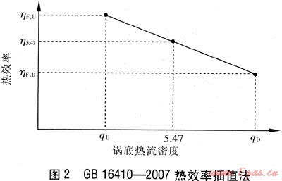 GB 16410—2007中的熱效率插值法是以鍋底熱流密度作為橫坐標,以熱效率作為縱坐標建立直角坐標系。當(dāng)用上限鍋測試熱效率時,其橫坐標點qU對應(yīng)的熱效率為ηF,U;用下限鍋測試熱效率時,其橫坐標點qD對應(yīng)的熱效率為ηF,D。然后以橫坐標為5.47的豎直直線與ηF,U、ηF,D兩點連線的交點的縱坐標值,作為此灶具燃燒器熱效率的最終結(jié)果η5.47(見圖2)。熱效率插值法是在不改變熱負荷的前提下得到的。