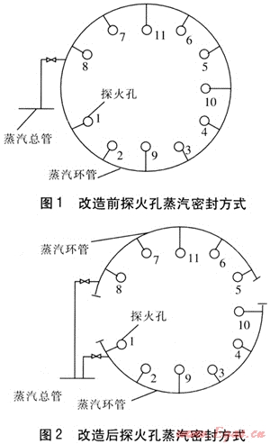 改造方案是:將原來(lái)的蒸汽環(huán)管從中間截?cái)喑蓛砂?,一半沿用原?lái)的探火蒸汽管和閥門,只是將兩端用堵頭堵住,主要用來(lái)密封5、6、7、8、11號(hào)探火孔;用1根直徑為40mm的無(wú)縫鋼管從蒸汽總管引至另一半環(huán)管上,加裝1個(gè)DN 40mm的截止閥作為控制用,這一半環(huán)管主要用來(lái)密封1、2、3、4、9、10號(hào)探火孔。經(jīng)過(guò)這一改進(jìn)后,提高了密封煤氣的蒸汽壓力,解決了在探火時(shí)因蒸汽壓力較低而造成密封效果較差、煤氣泄漏嚴(yán)重的問(wèn)題。