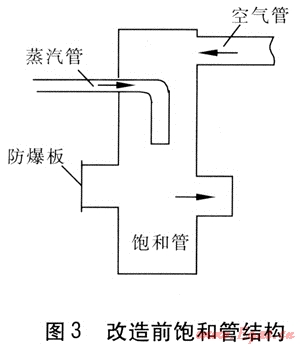 ④ 飽和管上裝有1塊0.5mm厚的退火鋁板作為防爆板,用于爐底部發(fā)生爆炸時(shí)泄壓。一方面,發(fā)生爐爐底爆炸時(shí)由于該防爆板采用平裝方式(見(jiàn)圖3),爆炸波和鋁片易傷到人;另一方面,蒸汽凝結(jié)水易對(duì)鋁板造成腐蝕,導(dǎo)致鋁板使用壽命縮短。