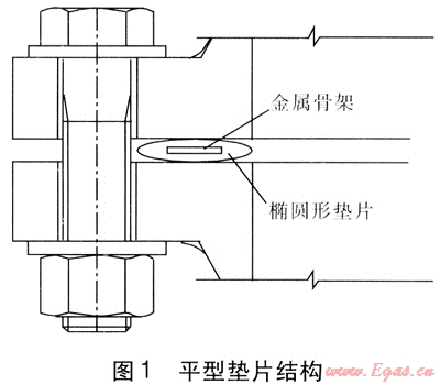 第1種結(jié)構(gòu)為平型墊片,其斷面幾何形狀為橢圓形,見圖1。當用于天然氣管道時,平型墊片表面非金屬部分可以采用丁腈橡膠等橡膠材料,并且在其中嵌裝環(huán)形金屬骨架。金屬骨架的橫截面為長方形,嵌裝在橢圓形橡膠墊片的中心部位。推薦在0.4MPa設(shè)計壓力下使用這種結(jié)構(gòu)形式的墊片。