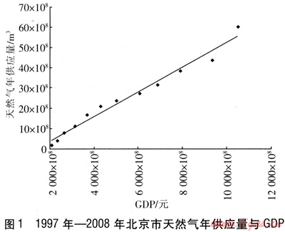 1997年—2008年北京市的GDP與天然氣年供應(yīng)量見表1,對應(yīng)關(guān)系見圖1,從圖1可知天然氣年供應(yīng)量與GDP存在線性關(guān)系。