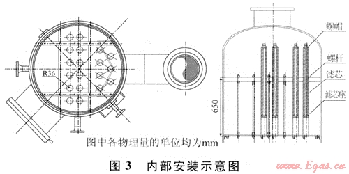 通過項(xiàng)目調(diào)研評(píng)估和可行性分析,決定拆除滌氣罐內(nèi)除沫網(wǎng),改裝19根高效過濾精度在0.05μm的頗爾纖維濾芯,方案經(jīng)過數(shù)次討論優(yōu)化,確定全部預(yù)制好到現(xiàn)場安裝,具體設(shè)計(jì)方案如圖2~4。