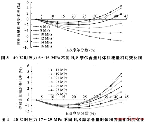 圖3、4分別給出了基于前述基準(zhǔn)條件,40℃時(shí)壓力為6~16MPa、17~29MPa和不同H2S摩爾分?jǐn)?shù)含量時(shí)體積流量相對(duì)變化情況。由圖3、4可知:在所列H2S摩爾分?jǐn)?shù)范圍內(nèi),隨著H2S含量增加,6~8MPa范圍內(nèi)體積流量變化始終負(fù)增長,呈下降趨勢;12~16MPa,17~27MPa的體積流量變化均開始負(fù)增長,后正增長;10MPa時(shí)與29MPa時(shí)類似,分別在H2S摩爾分?jǐn)?shù)為25%、20%附近時(shí)體積流量降至最低,分別降低3%和1.6%。