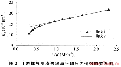 由式(1)知,用氣體作介質(zhì)測定無流速敏感性的巖石滲透率時,滲透率與平均壓力的倒數(shù)成直線關(guān)系,如圖1中的曲線1所示。