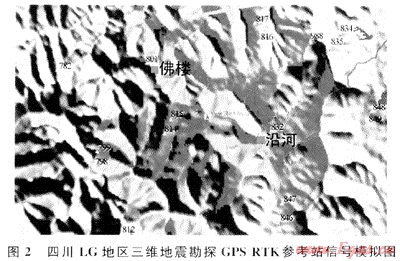 在GIS中利用數(shù)字高程模型,合理布設(shè)測(cè)量控制點(diǎn),提前進(jìn)行GPS基準(zhǔn)站的信號(hào)覆蓋情況模擬(圖2),并結(jié)合交通路線的分布情況,合理安排導(dǎo)線小組開(kāi)始施測(cè)的位置,從而保證每個(gè)GPS施測(cè)小組在交通最方便的地方開(kāi)始施測(cè)并能最大范圍地接收到來(lái)自GPS基準(zhǔn)站的GPS信號(hào)。如遇深溝或夾溝等信號(hào)盲區(qū),利用地形高差變化和交通情況,合理調(diào)配和架設(shè)中繼站,提高施測(cè)效率。