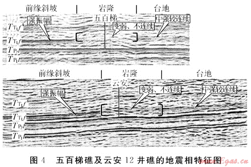 通過圖4五百梯礁以及云安12井礁等地震剖面分析,由圖4可見,對(duì)長(zhǎng)興組生物礁識(shí)別方法歸納如下:①生物礁礁前至前緣斜坡-海槽相剖面段,長(zhǎng)興組頂界反射能量明顯增強(qiáng);且互相獨(dú)具有良好的連續(xù)性和光滑性,在生物礁礁后至臺(tái)地相,其反射層振幅雖較前緣斜坡,海槽相弱,但連續(xù)性明顯優(yōu)于生物礁(灘)段反射。正是由于其區(qū)域地震相特征,顯示并指示出生物礁(灘)發(fā)育的剖面具體位置。②臺(tái)緣生物礁均發(fā)育在前緣斜坡-臺(tái)地間的坡折處,常與海槽相平行,相帶相對(duì)狹窄。③礁前、礁后地震相(包括振幅、連續(xù)性等)屬性發(fā)生橫向突變現(xiàn)象。④礁體自身地震相(如反射外形、振幅、連續(xù)等屬性),由于局部沉積環(huán)境不同存在一定差異,但都具有反射絮亂,不連續(xù)的基本特征。⑤其分布完全與現(xiàn)今構(gòu)造的展布無關(guān)。需要指出的是,垂直臺(tái)地-海槽相帶的地震測(cè)線其預(yù)測(cè)可靠性相對(duì)更高。