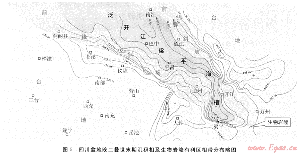 圖5是晚二疊世末期沉積相及生物礁(灘)有利區(qū)平面分布略圖,它清晰地展示出川北廣元-旺蒼海槽與川東開江-梁平海槽同屬一體,共同組成整個(gè)四川盆地的泛開江梁平海槽。該海槽呈西北向分布,上二疊統(tǒng)沉積厚度為55~165m,由川北大巴山山前廣元、南江一帶向南東到巴中、平昌沿線直至川東宣漢,于梁平附近消失,全長(zhǎng)約320km。海槽水體由西北向東南變淺,由川北寬闊海床向川東逐漸收縮呈狹窄海灣之勢(shì);沉積厚度隨著海槽海水向東南變淺而增厚;環(huán)海槽呈帶狀生物巖隆帶模式的生物礁(灘)有利區(qū)帶沿西岸川北劍閣-川中儀隴-川東龍會(huì)-梁平沿線附近,東岸沿川北樓子廟、川東黃金口一帶展布。整個(gè)巖隆有利區(qū)帶全長(zhǎng)約600km。從生物礁(灘)的地震相的外貌特征看,在川中儀隴平昌及川東黃龍場(chǎng)、梁平等區(qū)域的礁體上隆特征較明顯。而在巖隆至海槽相之間的前緣斜坡,其形態(tài)雖然陡緩、寬窄不一,但總體上具有在北緣黃金口、黃龍場(chǎng)一線,在西緣梁平一帶,其斜坡狹窄、坡度較陡的基本特征。在巖隆后的廣闊水域?qū)賲^(qū)域上平坦的、沉積環(huán)境相對(duì)穩(wěn)定的臺(tái)地相。