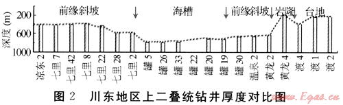 由于沉積環(huán)境不同,淺水臺(tái)地沉積速率大于深水海槽,其臺(tái)地沉積厚度明顯厚于海槽沉積存度;而在臺(tái)緣帶上,由于前積作用及各種海洋生物大量堆積所形成的碳酸鹽巖,使地層厚度增大。圖2是橫穿川東“開江-梁平”海槽相帶的上二疊統(tǒng)鉆井厚度對(duì)比直方圖,它直觀地反映出臺(tái)地厚度朝海槽方向變薄的區(qū)域前積沉積現(xiàn)象。