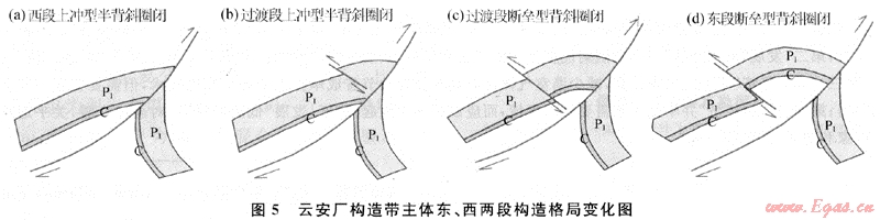 從云安廠主體東、西兩段構(gòu)造格局分析結(jié)果看,西段構(gòu)造表現(xiàn)為上沖型半背斜圈閉(圖5-a),東段表現(xiàn)為斷壘型背斜圈閉(圖5-d)。在東、西兩段的鞍部接觸部位,可見明顯的構(gòu)造格局漸變,在地震02YST05測(cè)線部位,出現(xiàn)一條南傾逆斷層,該斷層在二疊系地層內(nèi)部發(fā)生斷裂(圖5-b),在02YST08測(cè)線部位,該條斷層斷距明顯增大,向上消失于嘉陵江,向下消失于志留系,與主斷層結(jié)合,形成了明顯的“斷壘”型構(gòu)造格局(圖5-c)。
