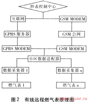 通過數(shù)字直讀式遠(yuǎn)程自動抄表系統(tǒng),將無線數(shù)字通信技術(shù)、傳感器技術(shù)、單片機(jī)技術(shù)及大型數(shù)據(jù)庫管理系統(tǒng)有機(jī)結(jié)合在一起。抄表控制中心可以通過互聯(lián)網(wǎng)將數(shù)據(jù)傳輸至GPRS服務(wù)器,發(fā)送無線信息經(jīng)GPRS MODEM(無線調(diào)制調(diào)解器)接收處理后傳送給小區(qū)數(shù)據(jù)適配器,或者可以通過GSM MODEM(GSM調(diào)制解調(diào)器)將數(shù)據(jù)轉(zhuǎn)換為無線信息發(fā)送到GSM公網(wǎng),經(jīng)小區(qū)GSM MODEM接收處理后傳送給小區(qū)數(shù)據(jù)適配器,小區(qū)數(shù)據(jù)適配器再命令數(shù)據(jù)采集器將采集到的燃?xì)獗碜x數(shù)按原路回傳到抄表控制中心。具體原理見圖2。