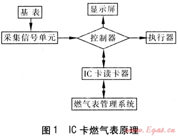 IC卡燃?xì)獗硎且阅な饺細(xì)獗頌橛嬃炕?,以IC卡為媒體,加裝電子控制器所組成的一種有預(yù)付費(fèi)功能的燃?xì)庥嬃垦b置。主要是由膜式燃?xì)獗?基表)、采集信號單元(量值傳感器、磁鋼)、控制器單元(計費(fèi)器)、執(zhí)行器(電磁閥等)、媒體(IC卡)、電源組成。用氣時基表數(shù)輪轉(zhuǎn)動,通過采集信號單元輸送脈沖信號到控制器上,利用IC卡完成與燃?xì)獗砉芾硐到y(tǒng)之間的數(shù)據(jù)交換,控制器對收到的數(shù)據(jù)、信號做出不同的反應(yīng)或發(fā)出指令,通過顯示屏顯示或?qū)?zhí)行器進(jìn)行開閉控制,對數(shù)據(jù)實現(xiàn)雙向反映,從而達(dá)到燃?xì)獗碜詣佑嬃靠刂?sup>[1]。具體原理見圖1。