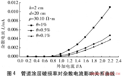 金屬管道埋地深度為h=2cm,管道與電阻絲水平凈距為d=20cm,土壤電阻率為ρ=30.10Ω·m,涂層破損率分別為θ=1%、0.5%、0.1%。在上述條件下,管道涂層破損率對雜散電流影響關(guān)系曲線見圖4。從圖4可以看出,在一定土壤電阻率條件下,隨著管道涂層破損率的增大,在相同外加電流條件下,管道內(nèi)的雜散電流也逐漸增大。因此,要減小管道內(nèi)雜散電流,就必須降低埋地金屬管道的涂層破損率,提高其表面防護性能,減少雜散電流對埋地金屬管道的腐蝕危害。