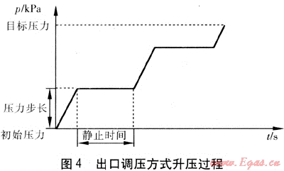 采用調(diào)壓器出口調(diào)壓方式進(jìn)行調(diào)壓時,需設(shè)置的狀態(tài)參數(shù)包括壓力步長、靜止時間、目標(biāo)壓力。壓力步長是連續(xù)動作的壓力變化值。靜止時間是每個壓力步長動作完成后至下一步長開始的停頓時間。目標(biāo)壓力是需升壓或降壓后達(dá)到的壓力??刂破靼丛O(shè)定的壓力步長、靜止時間運行,出口壓力傳感器將出口壓力p的信號反饋到控制器,當(dāng)p等于目標(biāo)壓力時,升壓或降壓停止。圖4為采用出口調(diào)壓方式進(jìn)行升壓的過程。