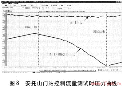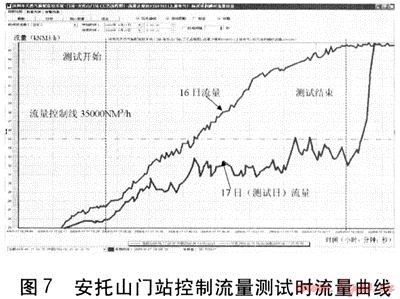 目前兩座門站沒有設(shè)置限流裝置,上游也沒有對門站采取限流。當(dāng)出站壓力保證穩(wěn)定,不采取降壓以利用次高壓管道的管道儲氣的情況下,在用氣高峰時段,流量超過合同規(guī)定的最大提取速率,超過最大提取速率提取的氣量將按正常價格的150%計價。針對以上實際情況,將壓力遙調(diào)的功能進(jìn)行拓展,通過在高峰時段降低出口壓力,減小調(diào)壓器開度,從而間接地降低流量。在高峰時段需頻繁降壓,將流量控制在上游要求的最大提氣速率的95%以內(nèi),用戶需求的不足部分通過降低管道壓力、利用管道儲氣來補充。低峰時升高壓力來補充管道儲氣。這種頻繁的調(diào)整,在沒有遙調(diào)系統(tǒng)的情況下是很難實現(xiàn)的。圖7、8為改造后安托山門站晚高峰控制流量測試時的流量、壓力曲線。