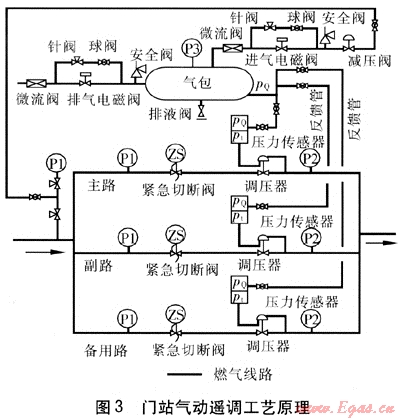 深圳市燃?xì)饧瘓F(tuán)股份有限公司門站氣動遙調(diào)系統(tǒng)的工藝原理見圖3。