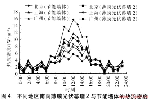 經(jīng)計算可得,不同地區(qū)南向薄膜光伏幕墻2與節(jié)能墻體的熱流密度見圖4。相比薄膜光伏幕墻1,節(jié)能墻體結(jié)合薄膜光伏組件后的節(jié)能率較低,經(jīng)計算得,節(jié)能率可達(dá)34%。