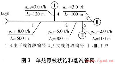 某單熱源枝狀飽和蒸汽管網(wǎng)(見圖3),管段1~5局部阻力當(dāng)量長度分別為:管段1:1個截止閥、7個方形補(bǔ)償器,局部阻力當(dāng)量長度為166.8m;管段2:1個直流三通、5個方形補(bǔ)償器、1個異徑接頭,局部阻力當(dāng)量長度為84.8m;管段3:1個直流三通、2個方形補(bǔ)償器、1個異徑接頭、1個截止閥,局部阻力當(dāng)量長度為46.3m;管段4:1個截止閥、1個分流三通、2個方形補(bǔ)償器,局部阻力當(dāng)量長度為37.6m;管段5:管件、閥門設(shè)置與管段4相同,局部阻力當(dāng)量長度為37.6m。熱源、用戶Ⅰ~Ⅲ的壓力分別為1.0、0.7、0.7、0.7MPa。