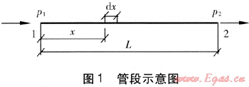 取長度為L的蒸汽管段為研究對象(見圖1),設(shè)管段起始節(jié)點(diǎn)為1,對應(yīng)壓力為p1;末端節(jié)點(diǎn)為2,對應(yīng)壓力為p2。