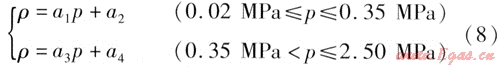 對于飽和蒸汽的熱力性質(zhì),國際水和蒸汽性質(zhì)協(xié)會(IAPWS)在1997年建議開始使用新的水和蒸汽熱力性質(zhì)的IAPWS工業(yè)公式(簡稱為IAPWSIF97)[3],該公式是為了滿足動力工業(yè)的需要而制定的,參數(shù)適用范圍大,表達(dá)式復(fù)雜。而常用供熱系統(tǒng)所用蒸汽壓力比動力系統(tǒng)低得多,范圍也小得多,因此在供熱系統(tǒng)常用壓力范圍內(nèi)對狀態(tài)參數(shù)進(jìn)行擬合??紤]到工程應(yīng)用中以采用相對壓力為主,這里對相對壓力范圍0.02~2.50MPa的飽和蒸汽進(jìn)行擬合,得到密度與相對壓力的關(guān)系式: