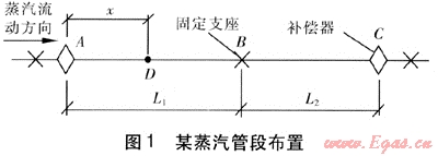 某蒸汽管段布置見圖1。長度為L1、L2的兩段直管段,設(shè)置3個(gè)固定支座和兩個(gè)波紋管補(bǔ)償器A、C。設(shè)暖管前鋼管溫度為θ1、暖管蒸汽溫度為θ2、管道單位長度質(zhì)量為ml。蒸汽由A端進(jìn)入,流速為v。與直徑相比,鋼管的壁厚較小,且鋼材的熱導(dǎo)率較大,忽略管壁的溫升過程,即按蒸汽到達(dá)之處管壁溫度與蒸汽溫度相同考慮。當(dāng)暖管蒸汽到達(dá)點(diǎn)A,并從點(diǎn)A繼續(xù)向前流動(dòng)一段距離菇到達(dá)點(diǎn)D時(shí),管段AD伸長量的計(jì)算式為: