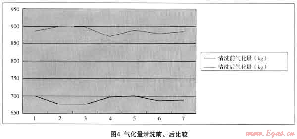 以我司新城氣化站一臺(tái)日本神樂1000kg/h氣化爐清洗前、后一周高峰用氣作比較(見表5、圖4)。