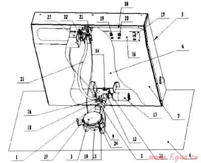 圖中所示:1、噴嘴,2、引射管,3、爐頭,4、櫥柜臺面或桌面,5、灶具主殼體,6、后殼面,7、前殼面,8、孔,9、鍋架,10、爐頭支撐架,11、轉(zhuǎn)軸固定架,12、轉(zhuǎn)軸,13、電動機(jī),14、上限位開關(guān),15、下限位開關(guān),16、控制電路板,17、電源輸入控制開關(guān),18、連接件,19、上升開關(guān),20、下降開關(guān),21、旋塞閥,22、旋鈕,23、脈;中點火器,24、點火針,25、分氣管,26、分氣管接頭,27、熱電偶式熄火保護(hù)裝置,28、進(jìn)氣管。