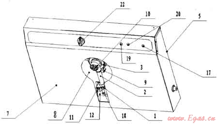 如圖1所示,在本具體實施例中,本研究項目立式家用燃?xì)庠畎ü鈾C(jī)構(gòu)、點火機(jī)構(gòu)、燃燒機(jī)構(gòu)以及可豎立擺放在櫥柜臺面或桌面4上或安裝在緊挨櫥柜臺面或桌面4的墻壁上的灶具主殼體5,此時灶具主殼體5的高度和寬度都明顯大于其厚度;所述供氣機(jī)構(gòu)包括進(jìn)氣管20、旋塞閥21和旋鈕22,所述進(jìn)氣管28與旋塞閥21相通,所述旋鈕22安裝在旋塞閥21上,所述旋塞閥21通過分氣管25及分氣管接頭26與連接件19連接相通;所述點火機(jī)構(gòu)包括脈;中點火器23和點火針24,所述脈沖點火器23與旋塞閥21連接相通并通過導(dǎo)線與點火針24連接,所述點火針24設(shè)置在爐頭3上;所述燃燒機(jī)構(gòu)包括噴嘴1、引射管2、爐頭3和鍋架9;所述噴嘴1的一端與連接件18連接相通,其另一端與引射管2的一端連接相通;所述引射管2的另一端與爐頭3連接并與爐頭3的火孔相通;所述爐頭3連接有鍋架9:所述灶具主殼體5的后殼面6上連接有轉(zhuǎn)軸固定架11,所述轉(zhuǎn)軸固定架11上設(shè)有一根與其相對轉(zhuǎn)動的轉(zhuǎn)軸12;所述燃燒機(jī)構(gòu)后端的連接件19與灶具主殼體5后殼面6的轉(zhuǎn)軸12連接;所述灶具主殼體5的前殼面7上設(shè)有供燃燒機(jī)構(gòu)在轉(zhuǎn)動過程中通過的孔8,如圖2所示;所述爐頭3底部連接有一個爐頭支撐架10。在本具體實施例中,本研究項目還在爐頭3邊安裝有熱電偶式熄火保護(hù)裝置27。