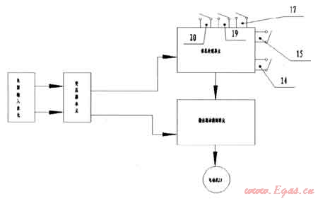 在本具體實施例中,如圖1和圖2所示,所述轉(zhuǎn)軸12的一端與設(shè)置在灶具主殼體5內(nèi)的電動機(jī)13的轉(zhuǎn)軸連接;所述轉(zhuǎn)軸固定架11上設(shè)有上限位開關(guān)14;所述燃燒機(jī)構(gòu)前端設(shè)有下限位開關(guān)15;所述電動機(jī)13、上限位開關(guān)14及下限位開關(guān)15均與控制電路板16電連接;所述控制電路板1 6 1-還電連接有電源輸入控制開關(guān)17、上升開關(guān)19及下降開關(guān)20。所述的電動機(jī)13、上限位開關(guān)14、下限位開關(guān)15、上升開關(guān)19、下降開關(guān)20以及控制電路板16組成一個可控制轉(zhuǎn)軸12轉(zhuǎn)動的轉(zhuǎn)軸自動轉(zhuǎn)動裝置。