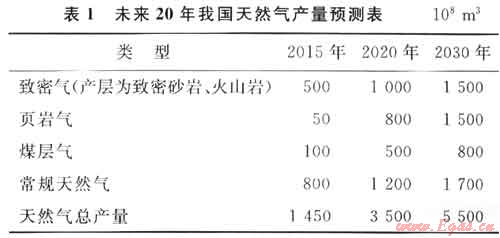 初步預計,未來10~20年,非常規(guī)天然氣產量將顯著增長,成為全國天然氣儲量、產量增長的主要來源之一,對保障全國天然氣供應將起到日益重要的作用。2015年全國天然氣產量將達1450×108m3,其中非常規(guī)天然氣產量為650×108m3,約占當年全國天然氣總產量的45%;2020年全國天然氣產量將達3500×108m3,其中非常規(guī)天然氣產量占到66%;2030年全國天然氣總產量將達到5500×108m3,其中非常規(guī)天然氣產量約占70%(表1)。