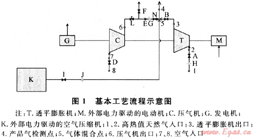 蘊含有大量壓力能的高壓天然氣,大多數(shù)情況下需要在調(diào)壓站通過調(diào)壓設備進行降壓處理。采用這種傳統(tǒng)的調(diào)壓方式,天然氣自身蘊含的壓力能在調(diào)壓設備降壓過程中被白白損失掉了,而且降壓過程還產(chǎn)生大量的噪音;另外,由于設備急劇降溫,還將有可能對調(diào)壓及管道設備運行造成威脅甚至損害。同時,這種傳統(tǒng)調(diào)壓方式并不能調(diào)配調(diào)壓站出站天然氣的熱值和燃燒特性參數(shù),各個調(diào)壓站的出站天然氣熱值不一致,燃燒特性參數(shù)也難以完全滿足管網(wǎng)要求。因此,需要實施一種新技術,能夠確保各個調(diào)壓站出站天然氣的熱值和燃燒特性滿足用戶需求。