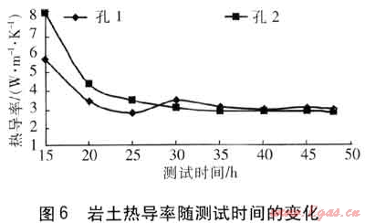 ③ 在實(shí)際測(cè)試中,采用線(xiàn)熱源模型進(jìn)行熱響應(yīng)測(cè)試,測(cè)試至少要進(jìn)行45h才能計(jì)算得到穩(wěn)定合理的巖土熱導(dǎo)率。