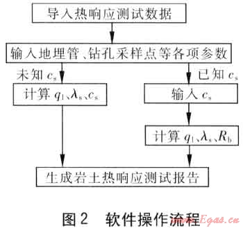 該軟件提供兩種流程求解巖土熱物性參數(shù)。求解流程1:將線(xiàn)熱源模型、式(2)相結(jié)合,求解巖土熱導(dǎo)率和單位體積熱容;求解流程2:已知巖土單位體積熱容,求解巖土熱導(dǎo)率和鉆孔內(nèi)熱阻。