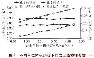 ④ 基于線(xiàn)熱源模型和雙參數(shù)估計(jì)法,巖土的單位體積熱容對(duì)熱導(dǎo)率幾乎沒(méi)有影響,對(duì)鉆孔內(nèi)熱阻有一定影響。
