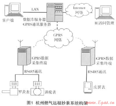 杭州燃?xì)膺h(yuǎn)程抄表系統(tǒng)由計(jì)量表具、GRPS無線網(wǎng)絡(luò)、GPRS數(shù)據(jù)采集終端、通訊服務(wù)器、數(shù)據(jù)庫服務(wù)器及客戶端組成。整個(gè)系統(tǒng)可分為數(shù)據(jù)采集層、無線網(wǎng)絡(luò)層和數(shù)據(jù)管理層3個(gè)層次。其系統(tǒng)架構(gòu)如下: