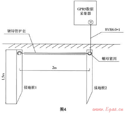 (3) 接地是通過金屬導(dǎo)線與接地裝置連接,將電氣設(shè)備和其他生產(chǎn)設(shè)備上可能產(chǎn)生的漏電流、靜電荷以及雷電電流等引入地下。遠(yuǎn)程抄表系統(tǒng)主要有兩種接地,一是防雷接地,二是屏蔽接地。防雷接地是將220V電源浪涌接地、24V電源浪涌接地、信號(hào)浪涌接地、流量計(jì)表頭感應(yīng)電接地。屏蔽接地是將RS485信號(hào)線屏蔽接地,防止高頻信號(hào)或雜波信號(hào)干擾影響DTU正常工作。與建筑物共用防雷接地體接地電阻應(yīng)小于1Ω;單獨(dú)使用鍍鋅角鋼打接地樁的接地電阻應(yīng)小于4Ω。與接地體連接的接地線應(yīng)使剛6mm2以上的BVR銅芯軟線或銅編織線。單根接地樁接地電阻達(dá)不到4Ω的,打接地樁應(yīng)選擇土層厚實(shí)、雜物較少的地方。單獨(dú)打一根接地樁無法滿足接地電阻要求,則應(yīng)再增加接地樁,直至滿足接地電阻要求。相鄰兩根接地樁之間的距離不應(yīng)小于2m。接地樁之間應(yīng)使用相同規(guī)格的角鋼焊接或使用6mm2以上的BVR銅芯軟線連接,并用螺絲緊固。其結(jié)構(gòu)如圖4。