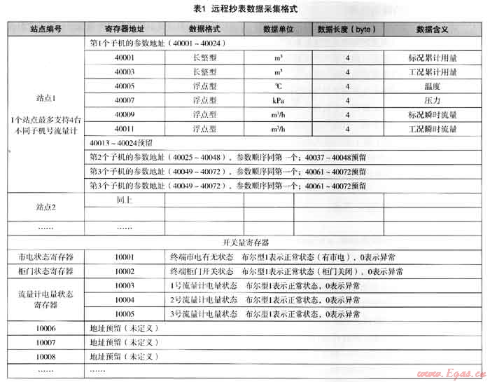 遠(yuǎn)程抄表采集的數(shù)據(jù)有兩種類型,一種是計(jì)量表具數(shù)據(jù),如流量、壓力、溫度等模擬量數(shù)據(jù);另一種是狀態(tài)信號(hào)數(shù)據(jù),如市電狀態(tài)、采集終端柜門狀態(tài)等開關(guān)量數(shù)據(jù)。數(shù)據(jù)采集格式見表1。