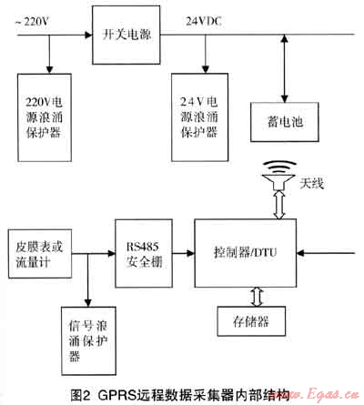 GPRS遠(yuǎn)傳數(shù)據(jù)采集器是遠(yuǎn)程抄表系統(tǒng)的重要設(shè)備,數(shù)據(jù)采集器具有RS485/232接口,通信速率為300~115200bps,通信協(xié)議采用MODBUS RTU/ASCⅡ工業(yè)通信協(xié)議,內(nèi)部供電一般選擇24VDC。一只數(shù)據(jù)采集終端(DTU)實(shí)際應(yīng)用中一般接1-3只燃?xì)獗?。?biāo)準(zhǔn)GPRS遠(yuǎn)程數(shù)據(jù)采集器內(nèi)部結(jié)構(gòu)如下: