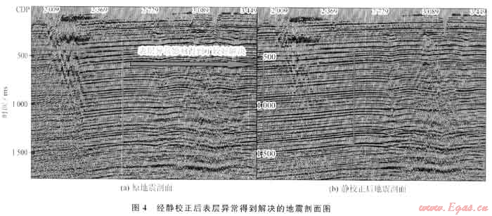三湖地區(qū)地表相對平坦,以往該區(qū)資料處理采用高程靜校正,導(dǎo)致在很多近地表異常地區(qū)地面資料較差。通過近兩年的研究,認(rèn)識到該區(qū)的速帶變化劇烈,存在較多的局部低降速帶異常。對靜校正方法的分析,最終確定了適合本區(qū)法——折射靜校正方法。基于模型約束的折射靜方法能提供高質(zhì)量的中、長波長分量,同時,其短靜校正精度也較高。在實際靜校正工作中,主要了以下技術(shù)要點:①通過詳細(xì)的近地表結(jié)構(gòu)的整剖,準(zhǔn)確建立近地表模型,為折射靜校正提供了合模型約束參數(shù);②通過對湖區(qū)、鹽堿地、鹽堿沼澤層含氣區(qū)等表層結(jié)構(gòu)對大炮初至質(zhì)量影響較大區(qū),采用處理手段提高初至質(zhì)量,提高了折射靜枝這些區(qū)域的應(yīng)用精度;③通過提高折射波的識別、的折射分層、消除排列邊界效應(yīng)的延遲時延拓,劉析反演模型,確定合理的靜校正計算標(biāo)志層,最大地解決了該區(qū)存在的靜校正問題,消除了一些表常的影響(圖4)。