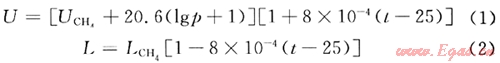 式中U為特定溫度和壓力下的爆炸上限,%;UCH4為常溫常壓下爆炸上限,%;p為壓力,MPa;t為溫度,℃;L為特定溫度和壓力下的爆炸下限,%;LCH4為常溫常壓下爆炸下限,%。