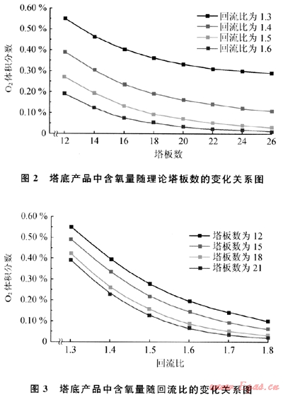 在精餾塔為進料狀態(tài),塔頂及塔底采出量固定的情況下,塔底產(chǎn)品中氧氣含量受2個主要參數(shù)即回流比和理論塔板數(shù)的影響。在精餾塔進料壓力為0.2MPa,溫度為-164℃的條件下,不同回流比條件下塔底產(chǎn)品中氧氣含量與理論塔板數(shù)的關系如圖2所示,不同理論塔板數(shù)條件下塔底產(chǎn)品中氧氣含量與回流比的關系如圖3所示。由圖2可知,在固定回流比的情況下,塔底產(chǎn)品中的氧氣含量隨著理論塔板數(shù)的增加而降低,而且隨著理論塔板數(shù)的增加,氧氣含量曲線逐漸變得平緩,也就是說在精餾塔塔板數(shù)比較多時,通過增加塔板的數(shù)量來降低煤層氣中的氧氣含量的效果已經(jīng)不明顯。圖3反映出在理論塔板數(shù)量固定的情況下,塔底產(chǎn)品中的氧氣含量隨回流比的增加而降低,而且曲線隨著回流比的增加也逐漸變得平緩,說明回流比較大時,再依靠增加回流比來降低煤層氣中的氧氣含量的效果也不明顯。由此可知,不能只依賴調節(jié)某一個參數(shù)來降低煤層氣中的氧氣含量,而是要同時考慮其他參數(shù)來綜合調節(jié)。模擬計算過程中,在精餾塔進料壓力為0.2MPa,溫度為-164℃,回流比為1.4,理論塔板數(shù)為25的情況下,塔底產(chǎn)品中氧氣的含量為0.16%(體積分數(shù)),此時產(chǎn)品中的氮氣為0。