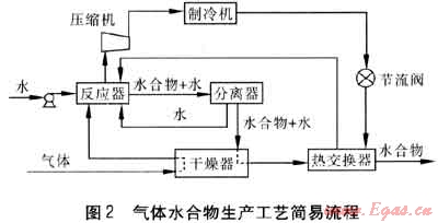 利用水合物形式進行氣體儲存的研究主要涉及到以下兩種技術(shù),一是利用水合物儲運天然氣或煤層氣的技術(shù)[21~23],二是水合物儲氫技術(shù)。水合物儲運天然氣技術(shù)已在日本進入應(yīng)用實施階段[24]。圖2為氣體水合物生產(chǎn)工藝簡易流程。氣體經(jīng)干燥器干燥凈化后與水在反應(yīng)器中生成水合物、水的混合物。從反應(yīng)器出來的混合物進入分離器,在分離器中進行初步分離。分離出的少量純水由分離器下部引出,由于這部分水有一種保持晶體結(jié)構(gòu)的趨勢,故重新循環(huán)進入反應(yīng)器;分離后得到的水合物經(jīng)干燥器干燥,并經(jīng)熱交換器進一步降溫后得到成品水合物。氣體則從反應(yīng)器排出后先進行壓縮,提高氣體壓力,再經(jīng)制冷機和節(jié)流閥進行降溫處理,再回收重新利用。目前水合物儲氫技術(shù)尚處于探索階段。