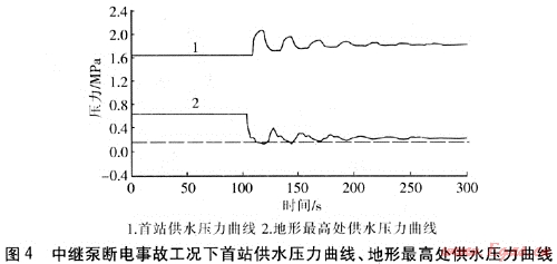 CJJ 34—2002《城市熱力網(wǎng)設(shè)計(jì)規(guī)范》第7.2.9、7.2.10條規(guī)定:“動(dòng)態(tài)水力分析應(yīng)對(duì)循環(huán)泵或中繼泵跳閘、輸送干線主閥門非正常關(guān)閉、熱源換熱器停止加熱等非正常操作發(fā)生時(shí)的壓力瞬變進(jìn)行分析。動(dòng)態(tài)水力分析后,應(yīng)根據(jù)分析結(jié)果采取下列相應(yīng)的主要安全保護(hù)措施:設(shè)置氮?dú)舛▔汗?;設(shè)置靜壓分區(qū)閥;設(shè)置緊急泄水閥;延長(zhǎng)主閥關(guān)閉時(shí)間;循環(huán)泵、中繼泵與輸送干線的分段閥連鎖控制;提高管道和設(shè)備的承壓等級(jí);適當(dāng)提高定壓或靜壓水平;增加事故補(bǔ)水能力。”