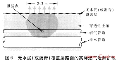 圖7為水泥(或?yàn)r青)覆蓋層良好路面的實(shí)際燃?xì)庑孤U(kuò)散[6、7]。圖8為水泥(或?yàn)r青)覆蓋層有裂隙和有檢查井路面的實(shí)際燃?xì)庑孤U(kuò)散[8]。