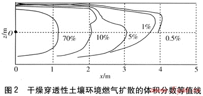 圖2為干燥穿透性土壤環(huán)境燃?xì)鈹U(kuò)散的體積分?jǐn)?shù)等值線(xiàn),圖3為潮濕穿透性土壤環(huán)境燃?xì)鈹U(kuò)散的體積分?jǐn)?shù)等值線(xiàn)。