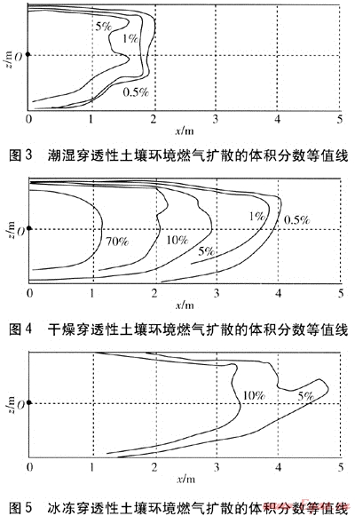 圖4為干燥穿透性土壤環(huán)境燃?xì)鈹U(kuò)散的體積分?jǐn)?shù)等值線(xiàn),圖5為冰凍穿透性土壤環(huán)境燃?xì)鈹U(kuò)散的體積分?jǐn)?shù)等值線(xiàn)。