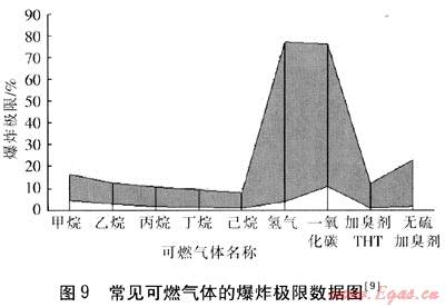 由于可燃?xì)怏w種類(lèi)很多而性質(zhì)差異很大,為統(tǒng)一地描述其爆炸特性,通常采用爆炸極限這一參數(shù)。特別需要指出的是,某種可燃?xì)怏w的爆炸極限的值是通過(guò)實(shí)驗(yàn)得到的客觀恒定值。圖9是常見(jiàn)可燃?xì)怏w的爆炸極限數(shù)據(jù)圖[9],表5是常見(jiàn)可燃?xì)怏w的爆炸極限數(shù)據(jù)表[9]。
